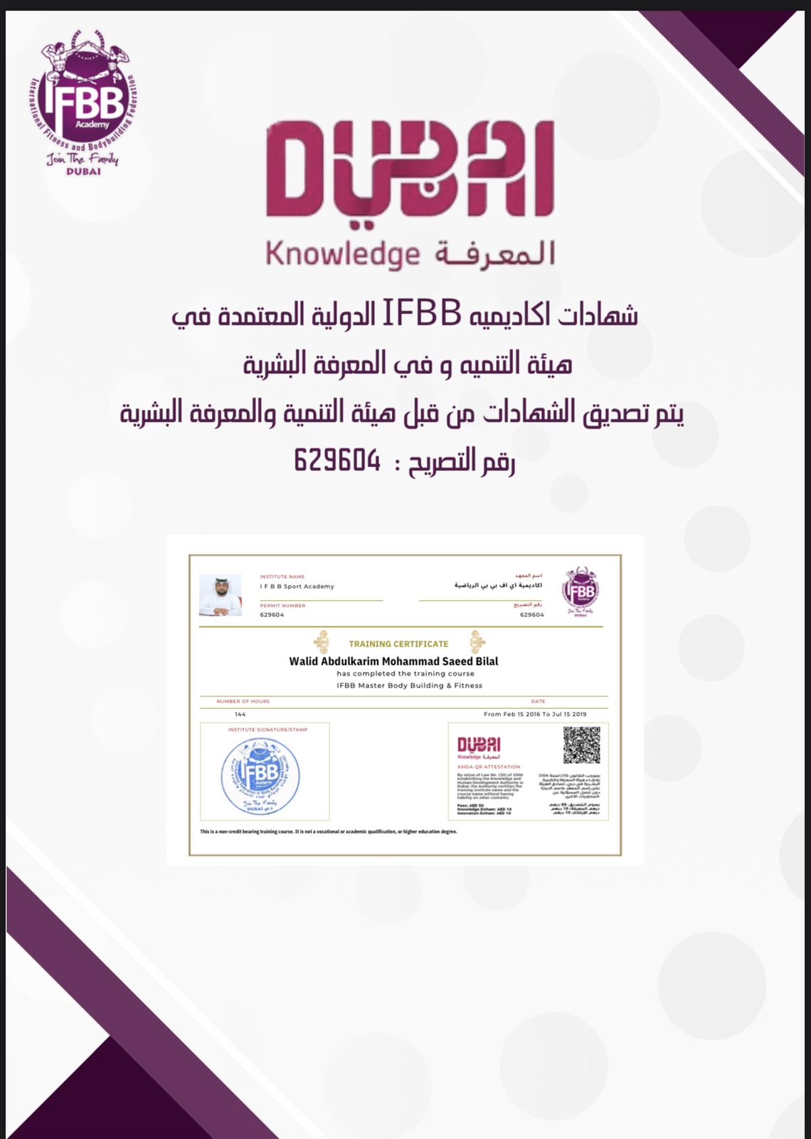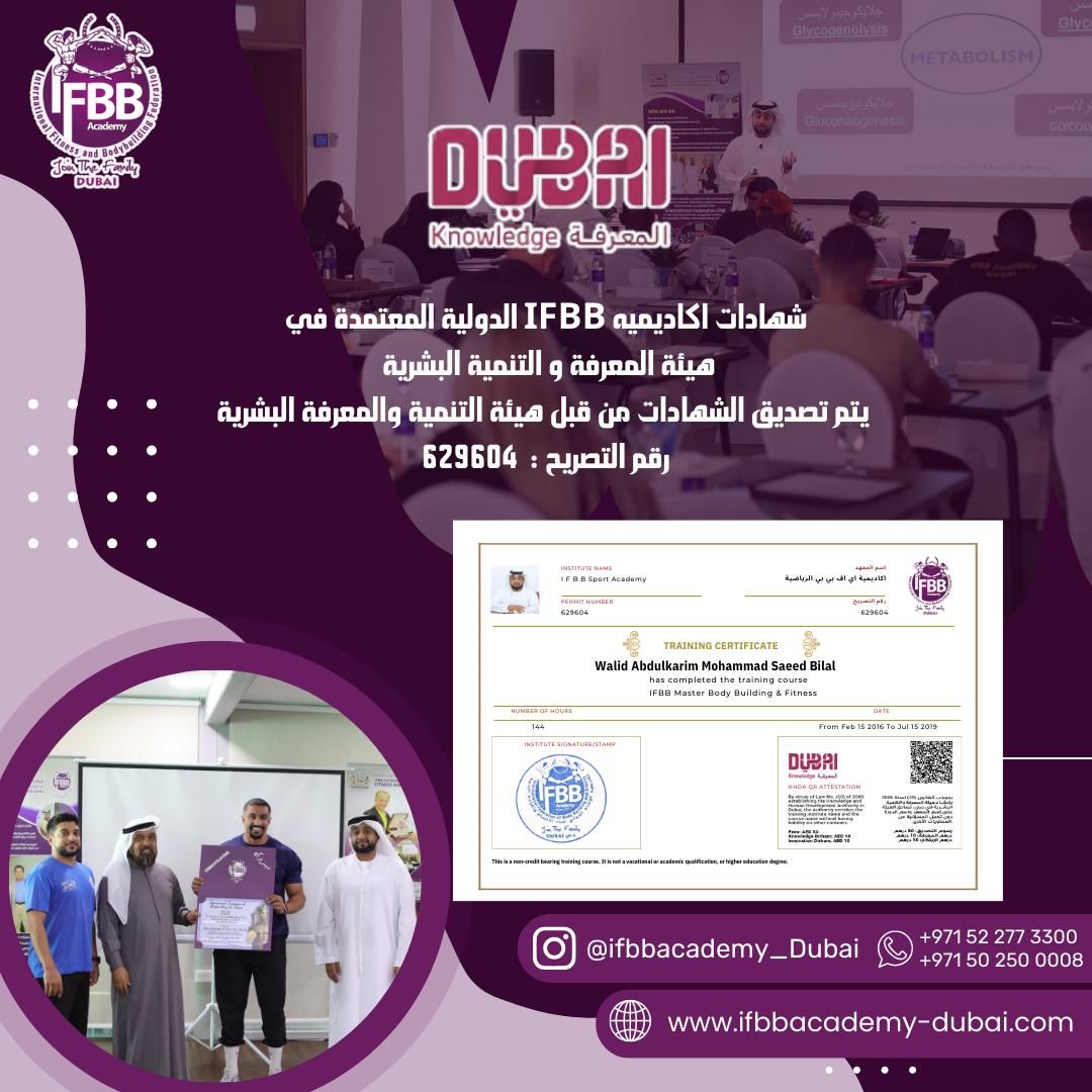 اعتمدت هيئة المعرفة والتنمية البشرية في دبي، أكاديمية IFBB لبناء الأجسام واللياقة البدنية في دبي ضمن هيئاتها التعليمية الخاصة المعترف بها في الإمارة، وبذلك خطت أكاديمية الاتحاد الدولي في دبي خطوة مهمة في مجالها الأكاديمي كأكاديمية متخصصة في صقل وتدريب وتأهيل المدربين والمتخصصين في رياضة بناء الأجسام واللياقة البدنية.