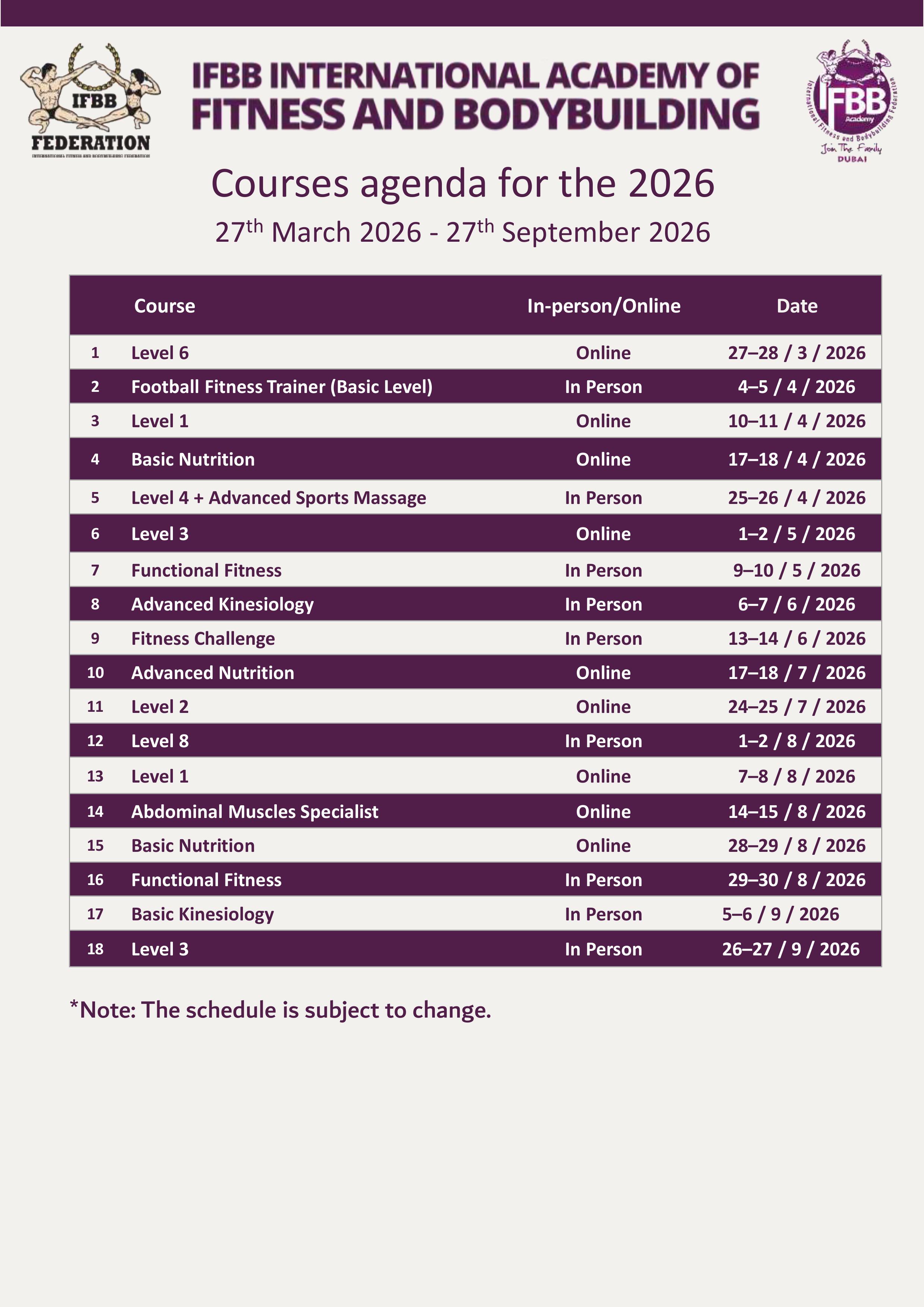 | COURSES | IN PERSON / ONLINE | DATE |